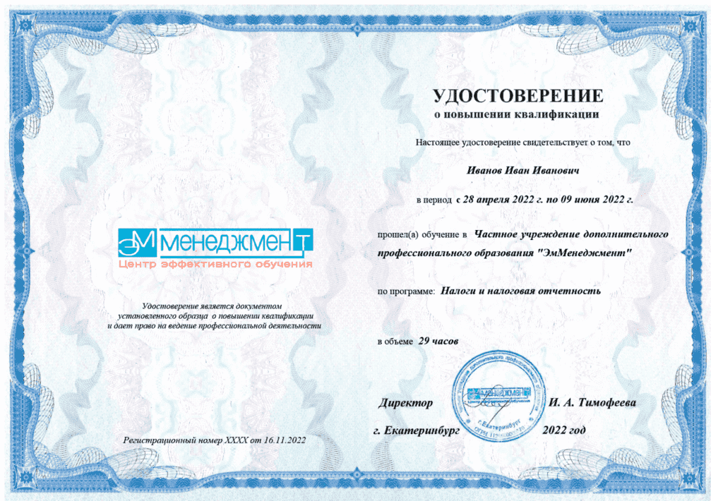 После прохождения курса обучения по налогам и налоговой отчетности в центре эффективного обучения ЭмМенеджмент в Грозном выдается удостоверение. Данный документ подтверждает, что слушатель действительно прошел теоретический курс и практику, приобрел знания и навыки в рамках программы.